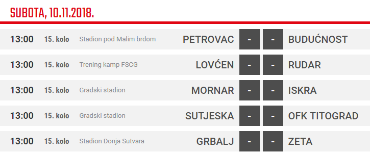 Na terenu Trening kampu FSCG Lovćen će ugostiti ekipu Rudara – biće to zasigurno vrlo težak meč za obje ekipe koje traže izlaz iz krize i “mirniju luku” kada je u pitanju plasman na tabeli prije dvosedmične pauze. Lovćen je bez ligaškog trijumfa punih 11 kola, samo su jednom u prethodnih 14 mečeva dali više od jednog gola na utakmici (protiv Mornara) i očigledno imaju problem u realizaciji. Ništa bolju formu nema ni Rudar,m a učinak od osam datih golova identičan je Lovćenovom. Rudar međutim, ima mnogo bolju defanzivu, primili su svega deset golova a uz to su izugubili samo jednu od osam poslednjih utakmica.