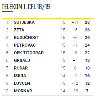 Sutjeska sada ima dva boda više od Budućnosti i Zete, koji su u ovom kolu ostvarili remije protiv Petrovca i Grblja. Podoričani se sa primorja vraćaju sa 1:1, iako su vodili od 42. minuta i gola Mihaila Perovića. Ipak, u 76. minutu Aleksandar Vujačić je poravnao udarcem sa biječe tačke.