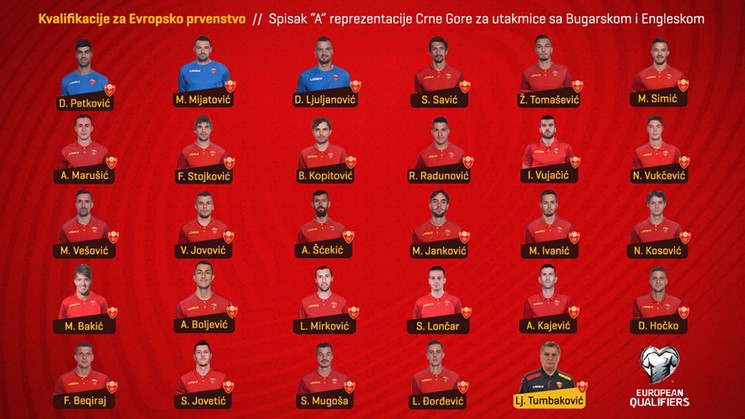 Za ove mečeve selektor Crne Gore Ljubiša Tuzmbaković pozvao je svih 29 kandidata koji su i u ranijem takmičenju, Ligi nacija, bili pozivani. Novih imena nema a ono što karakteriše i ovo okupljanje kao i početak kvalifiikacionog ciklusa jesu povrede – Hrabri sokoli biće oslabljeni neigranjem Stevana Jovetića i Stefana Savića: