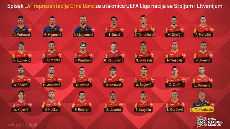 Selektor seniorske reprezentacije Crne Gore Ljubiša Tumbaković saopštio je spisak igrača koji će konkurisati za mjesto u našem nacionalnom timu za mečeve sa Srbijom i Litvanijom u UEFA Ligi nacija.