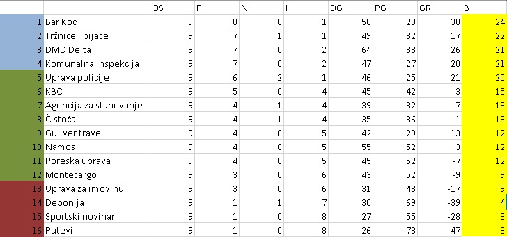 Ostale ekipe koje stanuju u gornjem dijelu tabele nijesu dozvolile iznenađenja – Tržnice i pijace pobijedile su Namos 4:3, Komunalna inspekcija bila je ubjedljiva protiv Puteva sa 10:3, a DMD Delta je u drugom poluvremenu srušila Sportske novinare sa, na kraju, velikih 11:5.