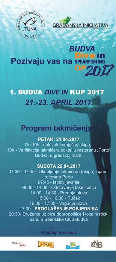 Budva će 22 aprila biti domaćin međunarodnog takmičenja u podvodnom ribolovu “BUDVA DIVE IN KUP 2017”. Ekipno takmičenje će okupiti najbolje crnogorske podvodne ribvolovce koji će “ukrstiti harpune” sa gostujućim ekipama iz Slovenije , Hrvatske i Srbije. Organizator takmičenja je Savez za sportski ribolov na moru Crne Gore a domaćin i tehnički organizator su KSR “TUNA” Budva i NVO Građanska inicijativa.Takmičenje će se održati u akvatorijumu Budvanske rivijere, od rta Zavala, ostrva Sveti Nikola do Zagorskog pijeska na Platamunima