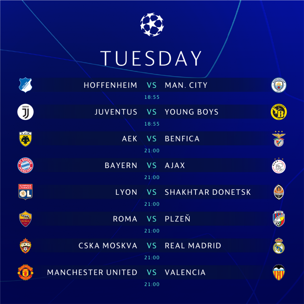 U prvom, Hofenhajm (Hoffenheim) će se potruditi da iznenadi Mančester Siti (Manchester City) – prvak Engleske, ankon poraza od Liona (Lyonnaisa) nema pravo na drugu grešku. U drugom meču Juventus je u grupi H, apsolutni favorit protiv Jang Bojsa (Young Boys) iako nastupa bez Ronalda.