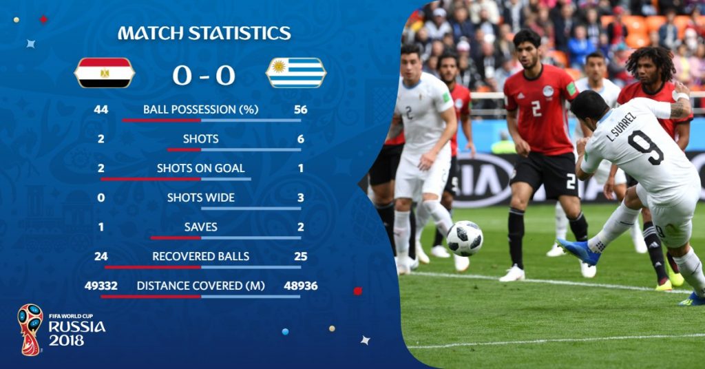 Meč u Ekaterinburgu bio je vrlo lošeg kvaliteta sa malo prilika za gol – Cavani je u finišu utakmice pogodio stativu iz slobodnog udarca, prije toga njegov opasan udarac odbranio je El Shanawy dok je Suarez imao dvije poluprilike.