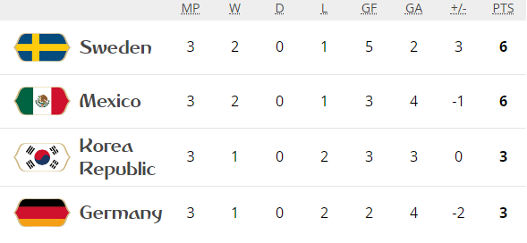 Švedska je sa prve pozicije u grupi F otišla među 16 najboljih reprezentacija svijeta poslije ubjedljive po bjede nad Meksikom (3:0). Augustinsson u 50, Granqvist (62p) i Alvarez (autogol) bili su strijelci za selekciju “tri krune” ali su “sombrerosi” imali sreće da Njemačka ne pobijedi pa će i oni u 1/8 finala, sa drugog mjesta.